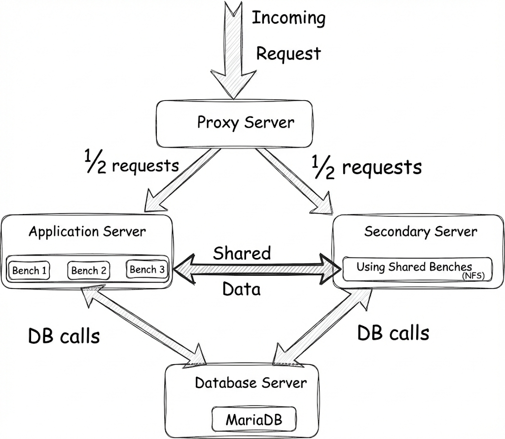 When a scale-up is triggered, the system follows a carefully ordered sequence to ensure zero downtime. First, the secondary application server is started. Since it was already provisioned and configured, this step is quick. Next, we wait until the server is fully healthy (viz., benches and services are running correctly). Once ready, the proxy layer is informed about the secondary server. Incoming requests are then distributed across both servers, gradually reducing load on the primary server.