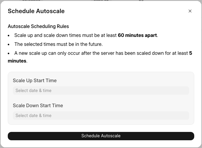 Alternatively, you can plan scale-ups and scale-downs when you predict a traffic spike (e.g. concurrent reports planned, batch jobs, or other events such as a sale or campaign). To schedule scaling, click on the "Schedule Auto Scale" button on the "Scheduled" sub-tab under the "Auto Scale" tab.
