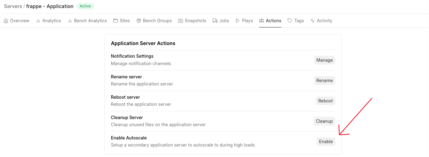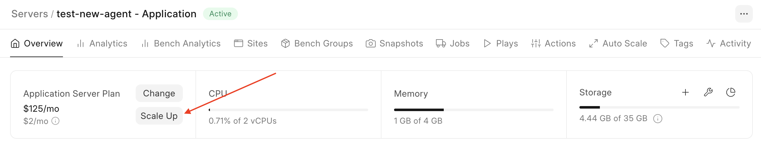 You can manually scale your application server up or down when you notice a spike in load and want immediate control. To do this, click on the "Scale Up" button given near the "Application Server Plan" section on the dashboard.