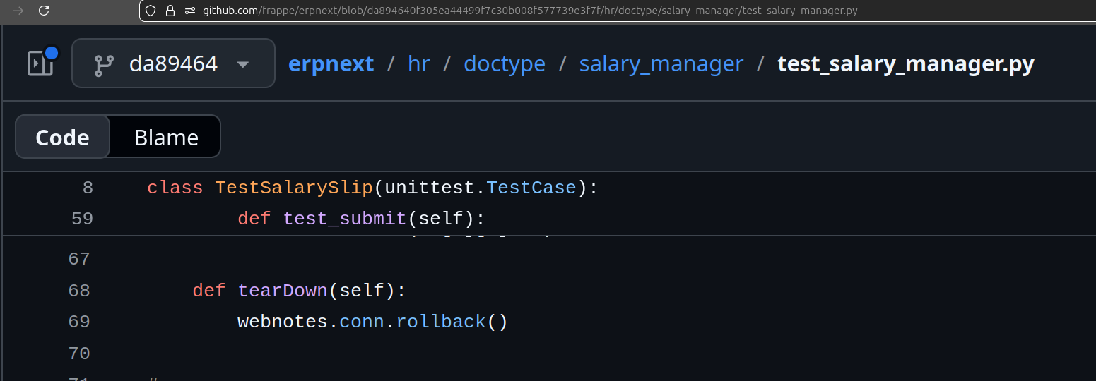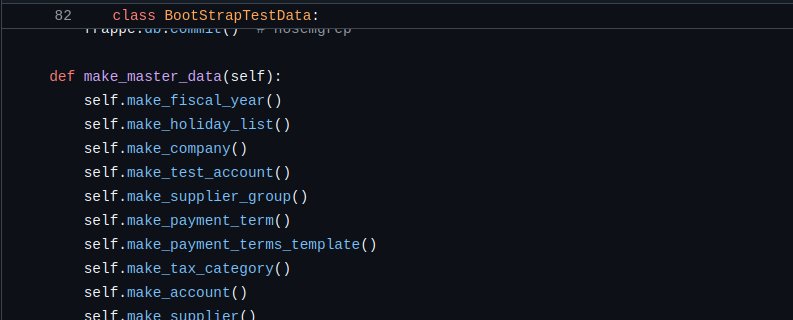 test_records.jsonwill be loaded first or in what order. You have no control on how it deduplicates individual test data. You have no control on when it does a commit and or a rollback. Everthing is implicit. - No Locality - While writing/debugging test there was this need to jump across apps to understand how the test runner or utilities work. So, if you are writing test on HRMS and using some setup method in ERPNext, you'll have to look at both ERPNext and Framework code. Nothing saps your working memory as context-switching.