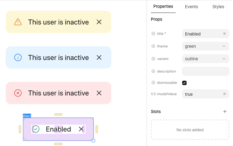 Alert only had a warning type, not it has theme, variant, description, dismissible