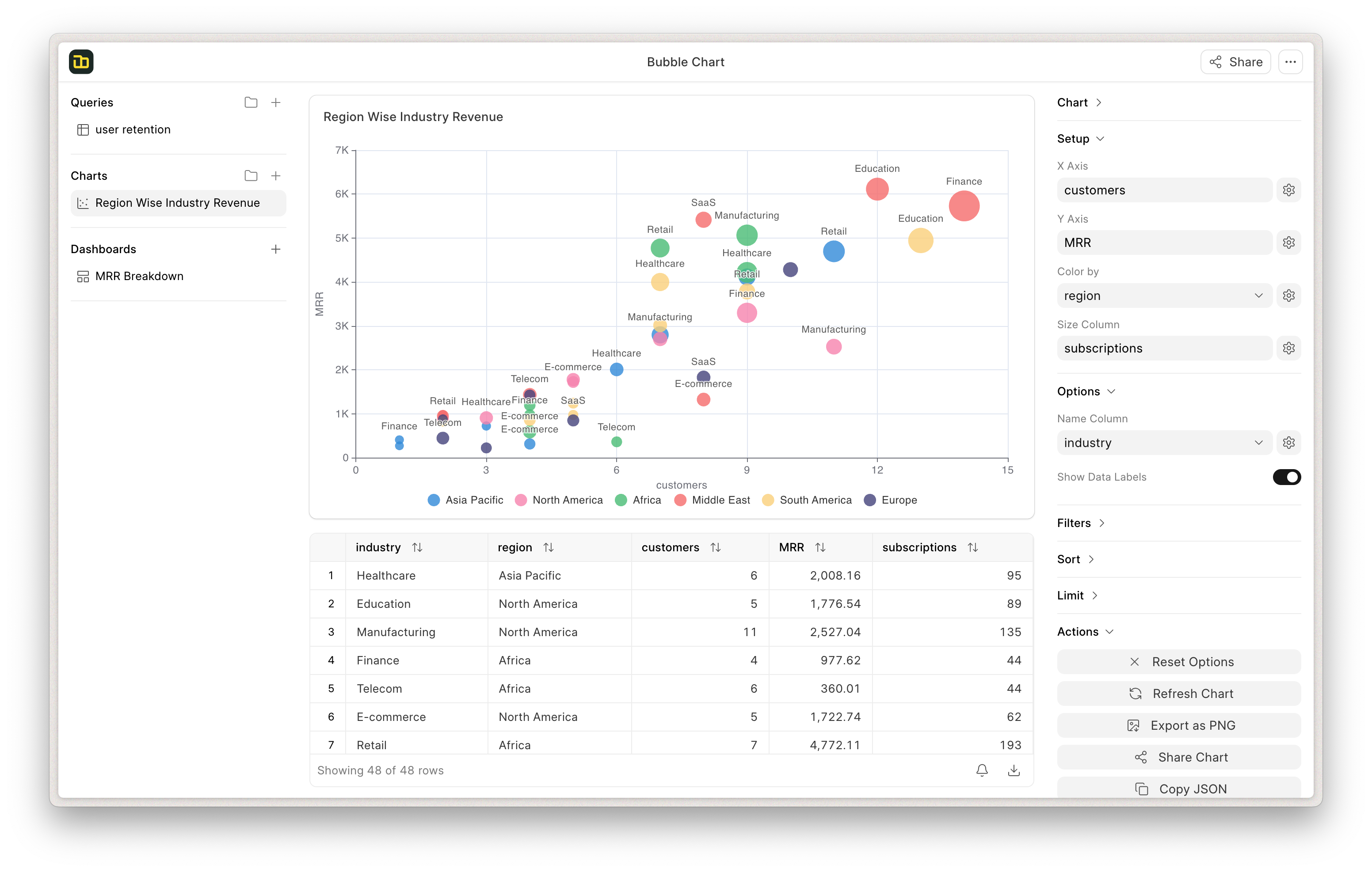 We know sometimes 2 dimensions are not enough to tell the full story. Using bubble chart you can compare Market Share, Revenue and Industry in one chart simultaneously by looking at the clusters and variable bubble sizes. Makes it easier to spot outliers and correlations at a glance.
