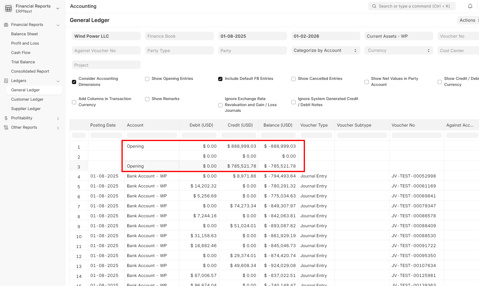 Our general ledger always reported total opening debit and credit as the first row. Since this was a non-standard practice and didn't serve much purpose, it has been changed.