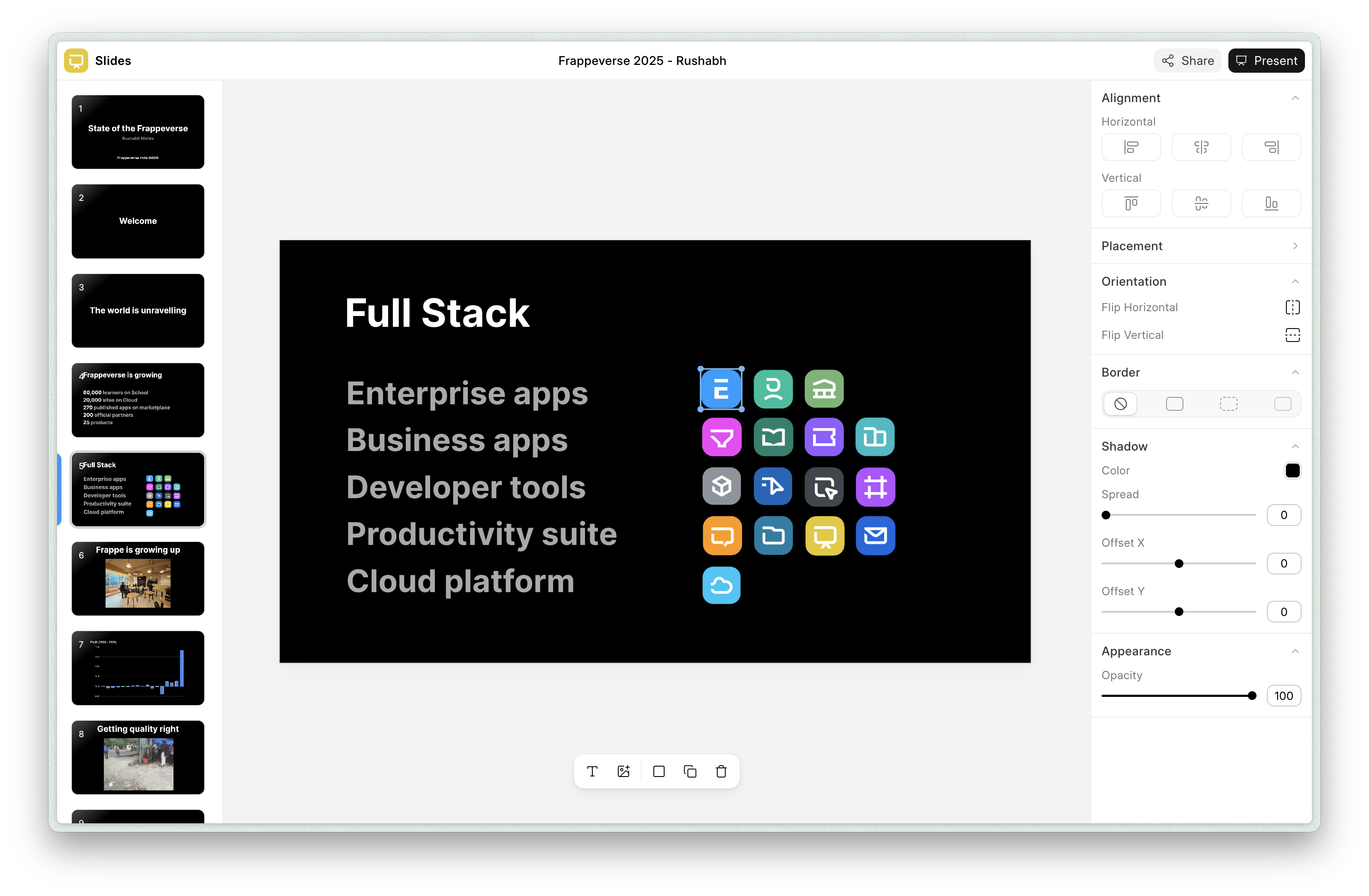 As many of y'all know from Frappeverse 2025, the keynotes given by our team were made and presented using Frappe Slides - a newly added app to our suite of apps. We made it open-source during the conference and took you through a journey of sharing the developer perspective and behind-the-scenes for making it all come together. Watch more on this here.