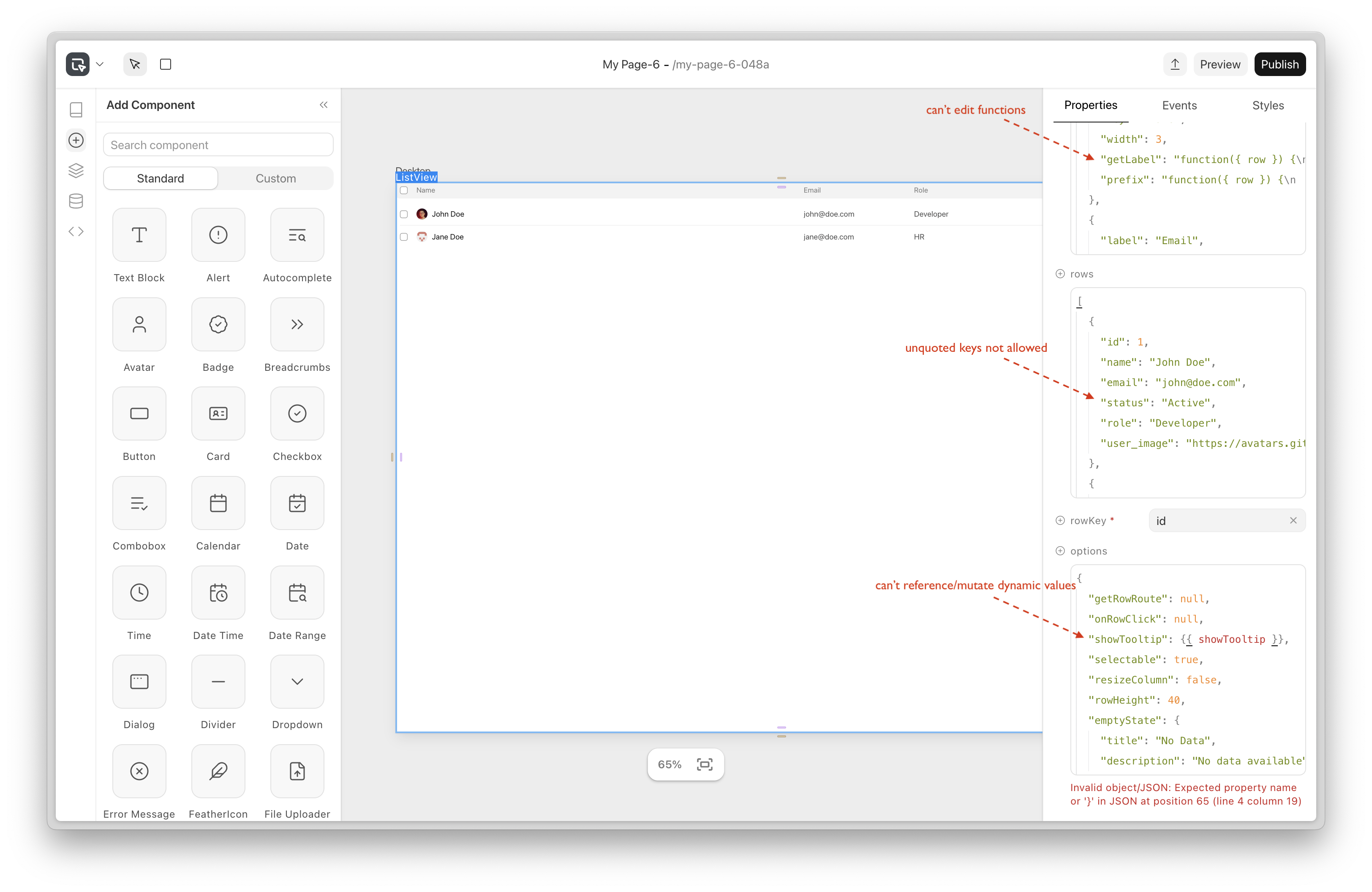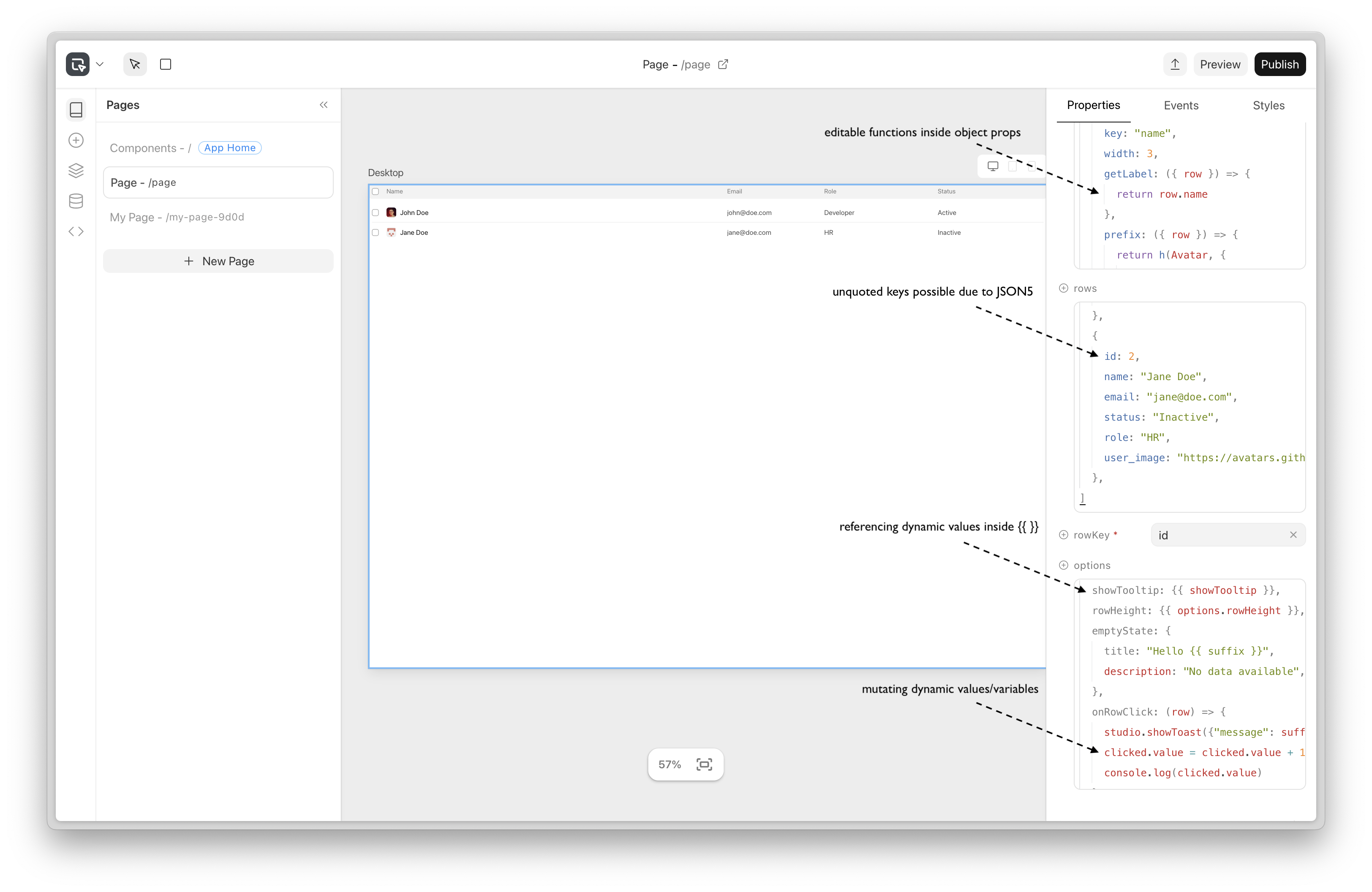 - Allow referencing variables & data sources in functions inside props and changing variable values.