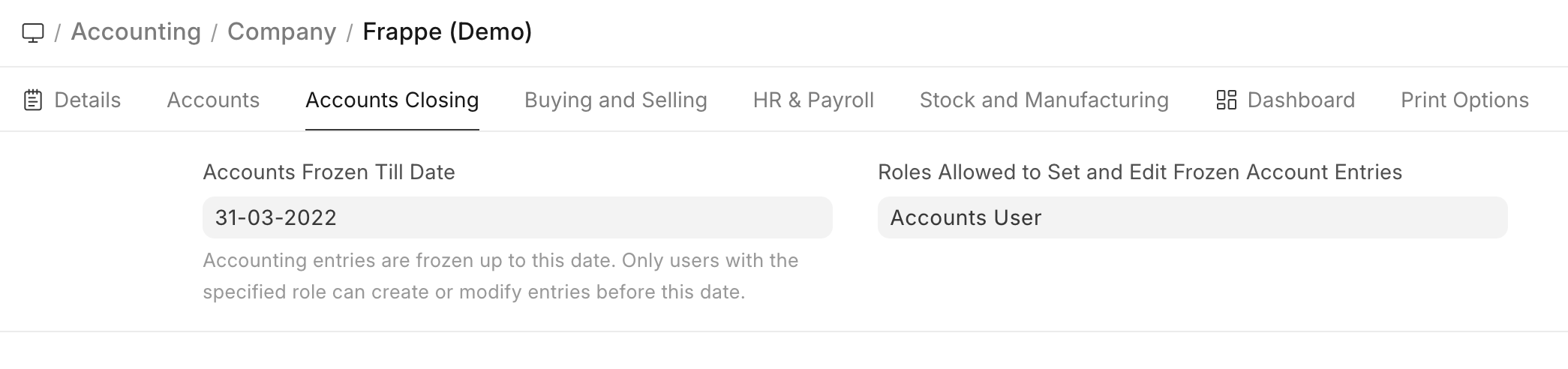 Account Freezing used to be a system level configuration. It has now been refactored to be company level configuration. This is highly useful for multi-company setup.