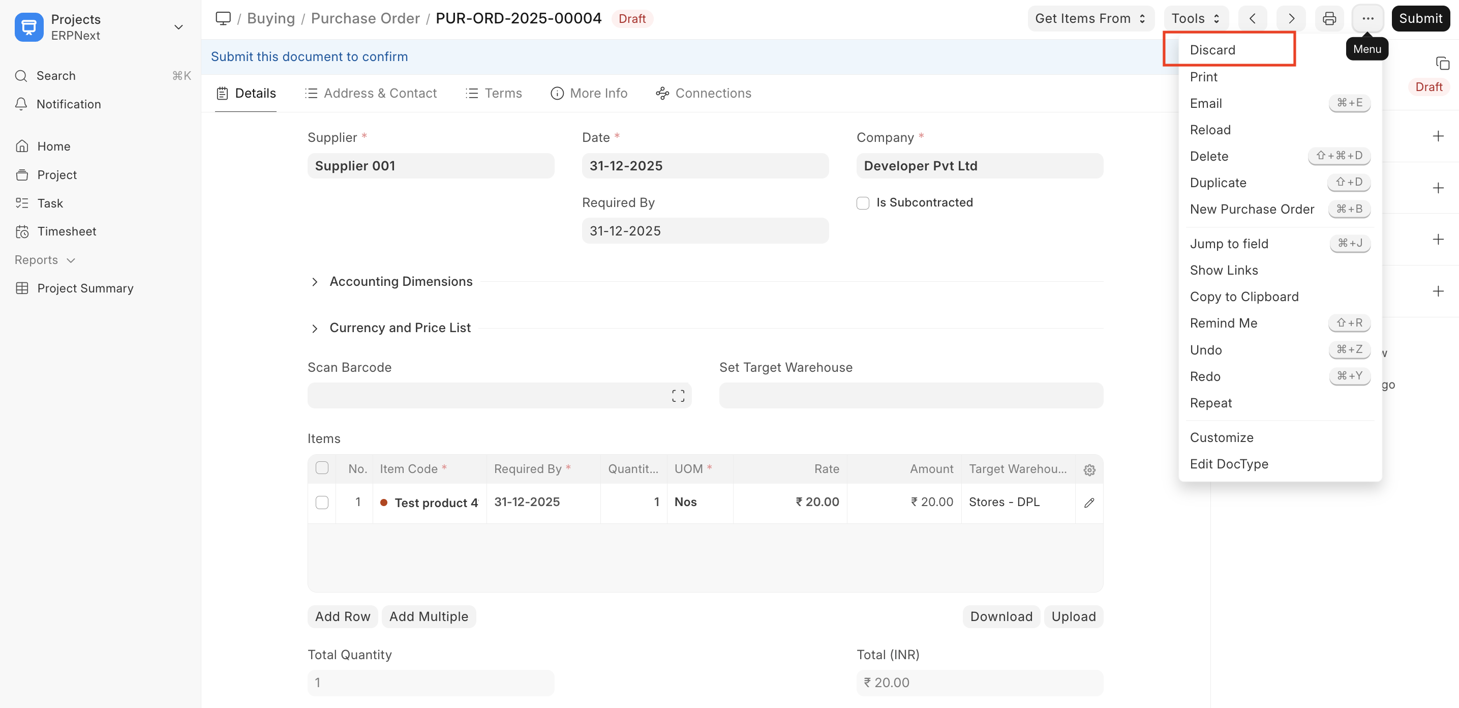 Previously, if a submittable document in Draft state was incorrect, the only option was to delete it, which resulted in the loss of its history. Now, with the new discard option, you can remove a draft document without submitting it or going through the cancellation process, preserving the record while keeping your workflow clean.