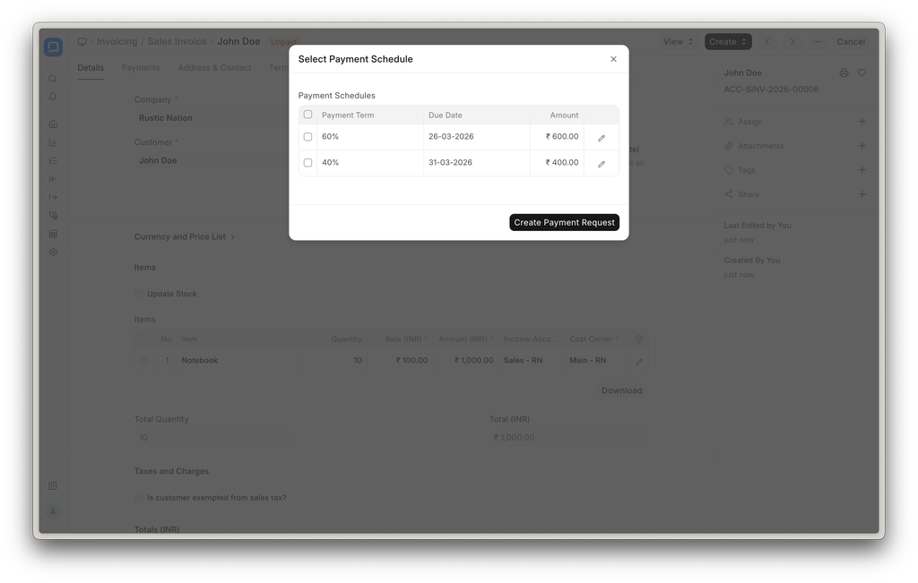 Users can now select the payment schedule from which a Payment Request should be created.