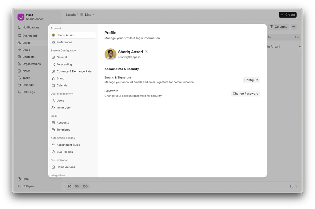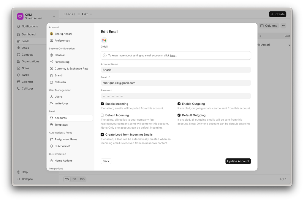 Each email account with incoming mail enabled can now be configured to automatically create Leads. This ensures that inbound emails are directly captured as potential opportunities without manual intervention.