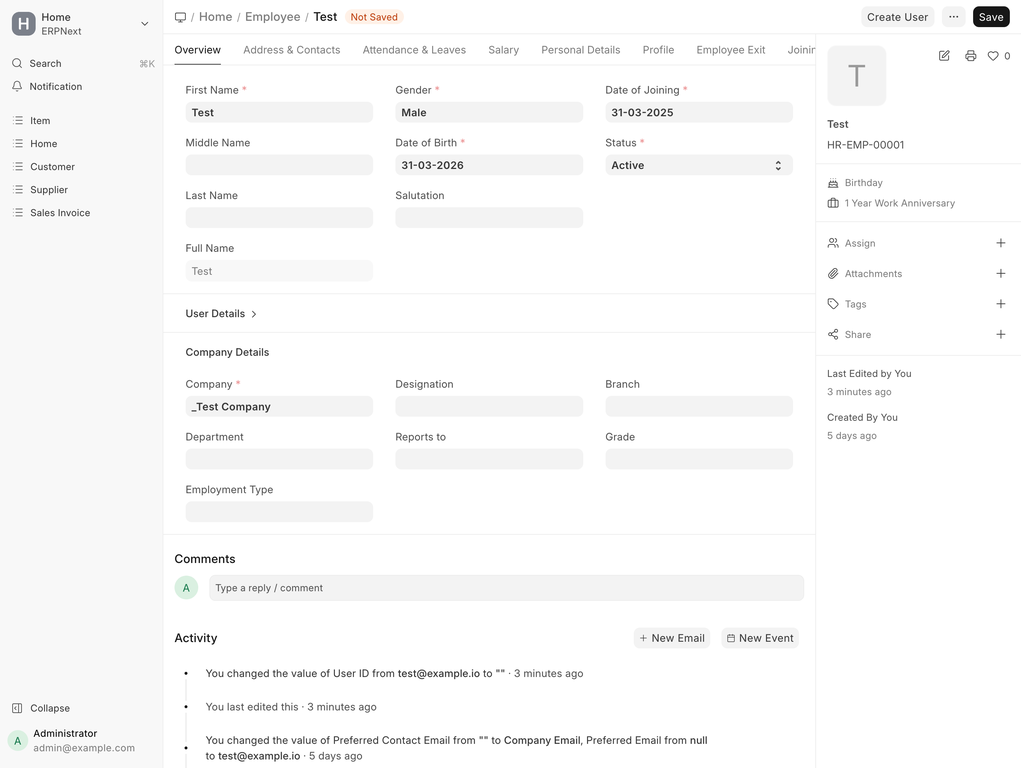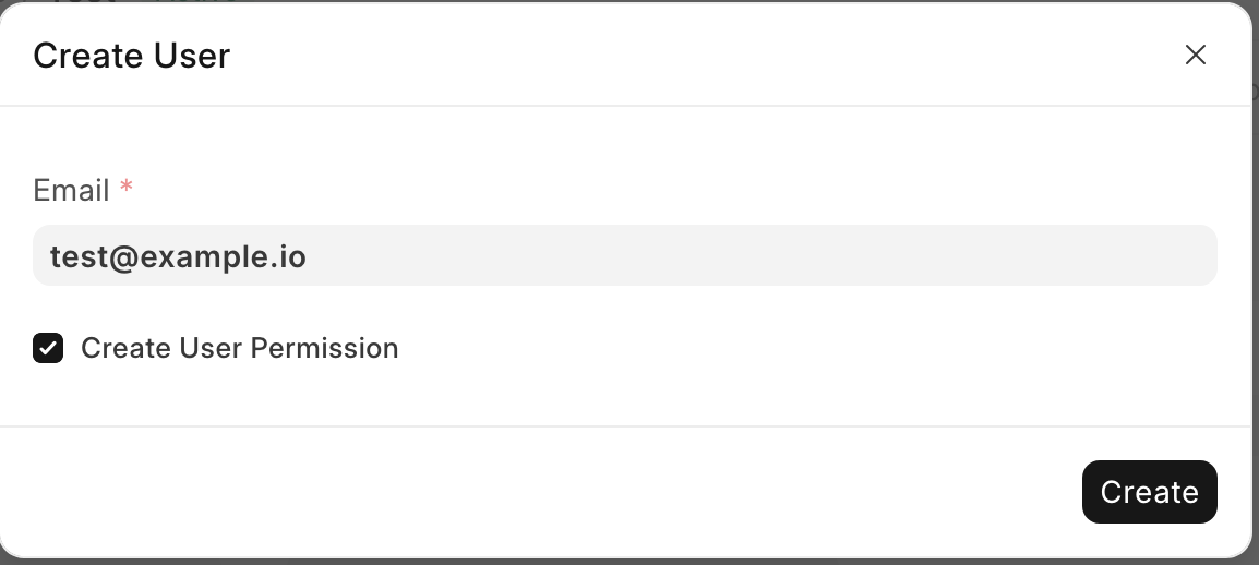 If an Employee is created without linking a User ID, a User can be created later from the Employee record: - Click on the Create User button from the top actions menu. - A dialog will appear with the Create User Permission option enabled by default. You can set or update the email in the dialog before creating the User. - On confirmation, the system will create the User, assign the necessary permissions, and link it to the Employee.