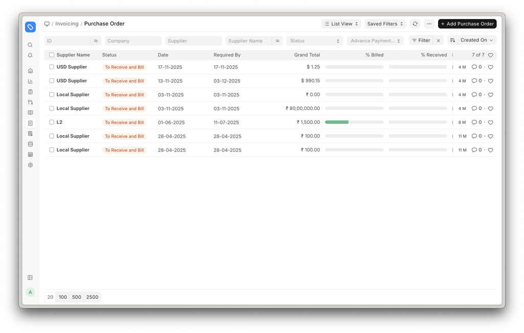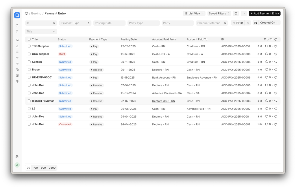 List view columns of core accounting doctype - Sales Invoice, Purchase Order, Journal Entry, etc., have been improved. Fields that provide more context are given priority and shown by default.