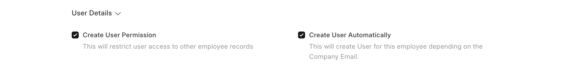 - The Create User Permission checkbox is enabled by default. This ensures that the newly created User has access only to their own Employee record and associated Company.