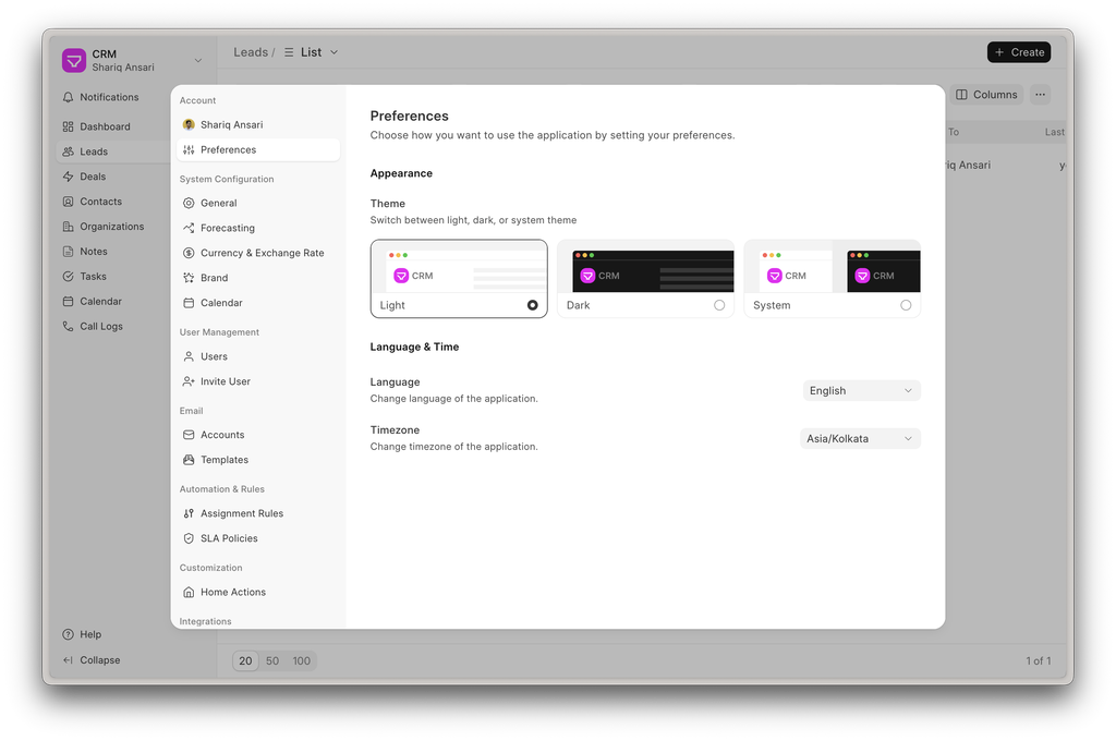 - Manage Preferences, including theme, language, and timezone