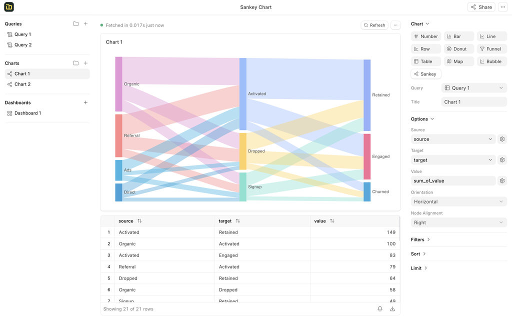 Perfect for tracking the flow of data between multiple stages or categories. A Sankey chart is ideal for visualizing customer journeys, supply chain movements, or budget allocations. It allows you to see not just the "where" but the "how much" as data moves through your defined paths, which makes complex relationships easy to figure out.