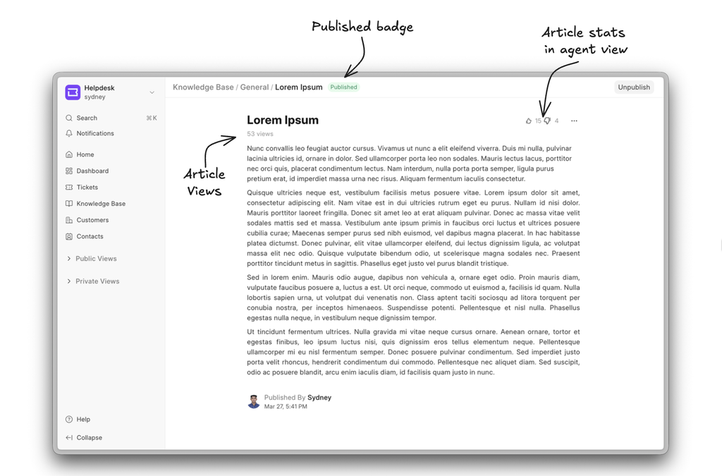 - Articles now give agents better visibility into engagement, with clear indicators for likes, dislikes, and total views. A published badge is now also added to indicate the article's status.