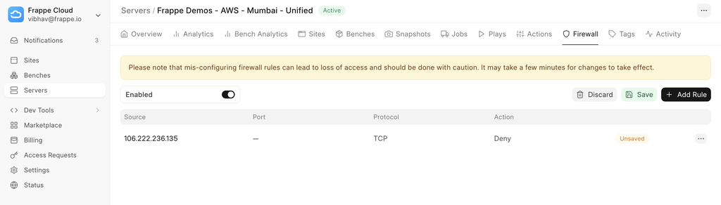 Until recently, Frappe Cloud has been using Firewall solutions offered out of the box by cloud providers (e.g. ClamAV). This month, we launched our own server-level firewall. This gives you direct control of which traffic can reach your servers and which cannot. You can define rules to allow or block access based on IP addresses, ports, and protocols. This is especially useful for limiting access to sensitive endpoints like SSH or internal services, without needing external tools or complex configurations.