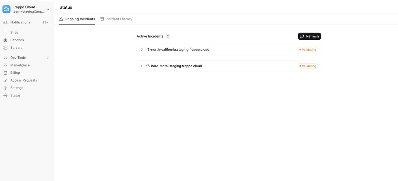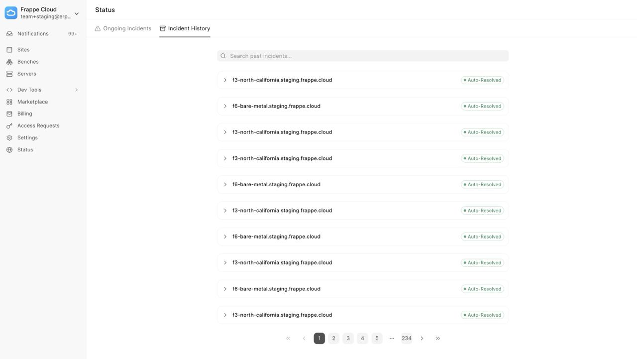 Earlier, when incidents occurred, we used to send users Email Notifications. These were often missed, and users felt a lack of visibility. This month, we introduced a Status Page on the Frappe Cloud dashboard. It gives you real-time visibility into incidents affecting your servers. You can now view ongoing issues as well as the history of past incidents directly within the dashboard (along with relevant details for each event).