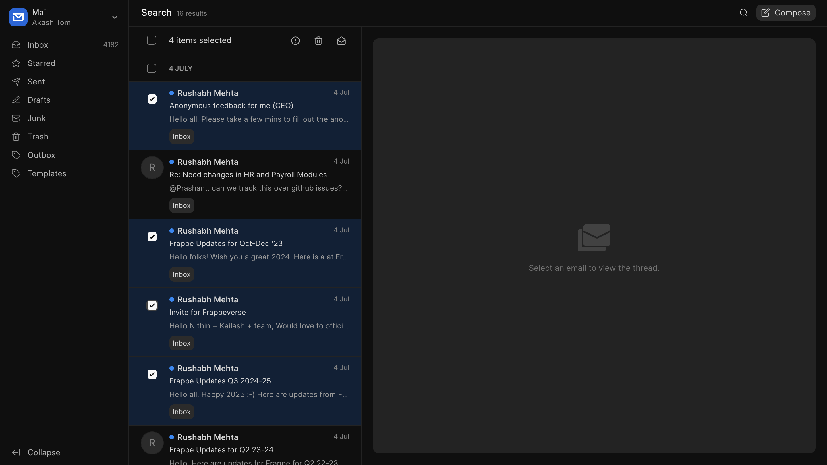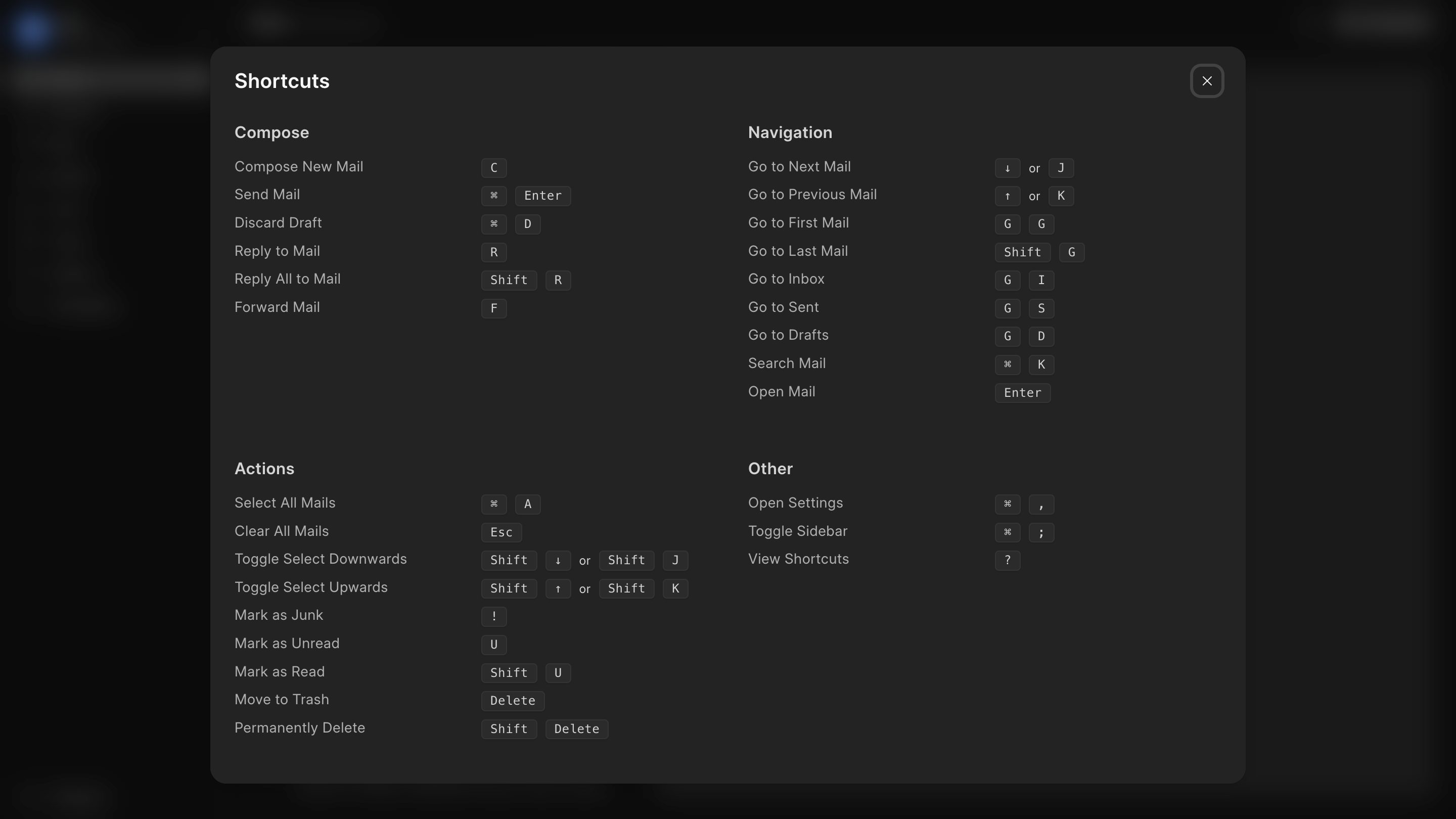 Frappe Mail now ships with several shortcuts to make your workflow faster and smoother. From navigating and selecting threads to marking, moving, or deleting mails, all without touching your mouse.