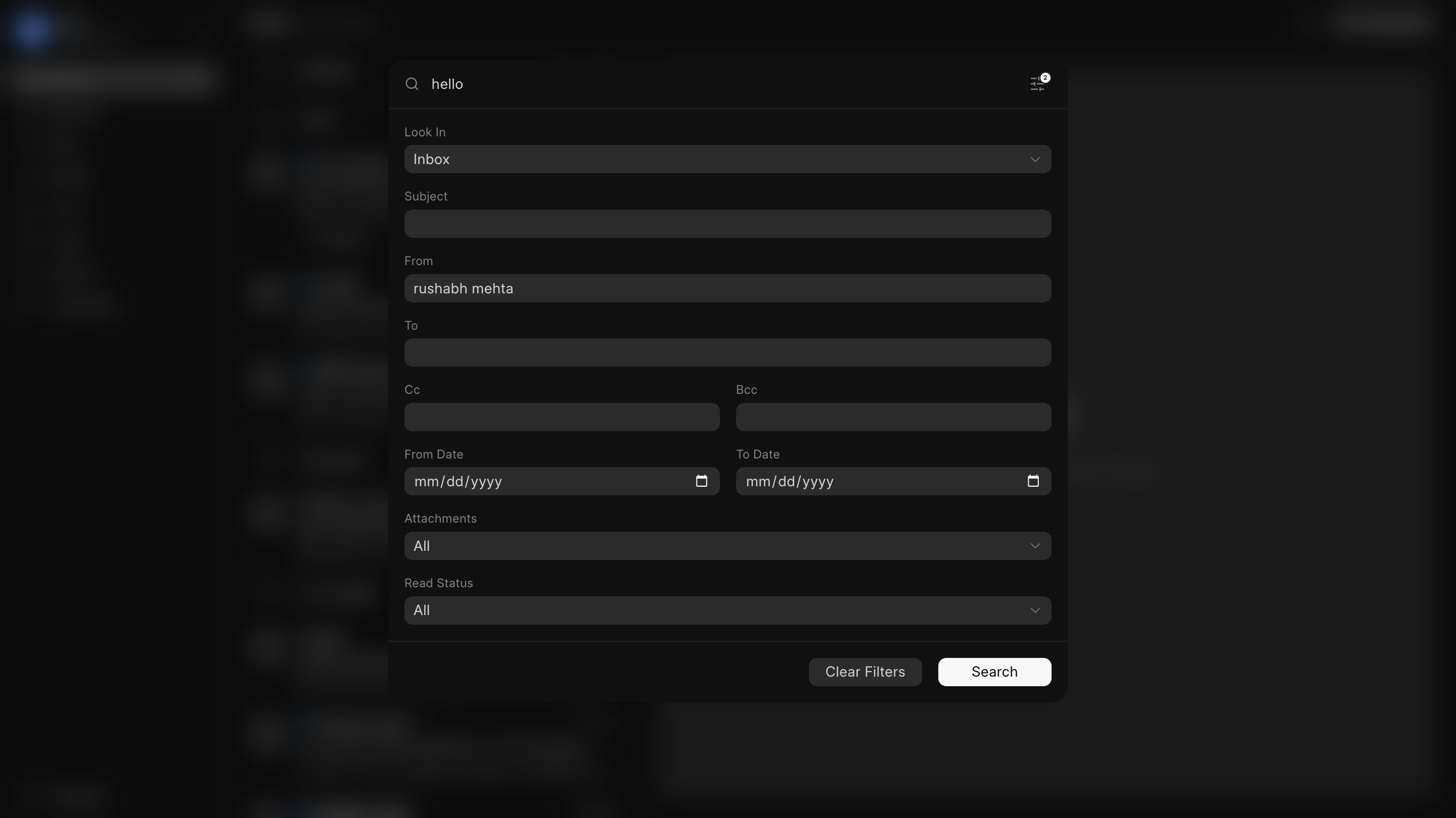 You can now search for mails enforcing explicit filters like Folder, Subject, Sender, etc.