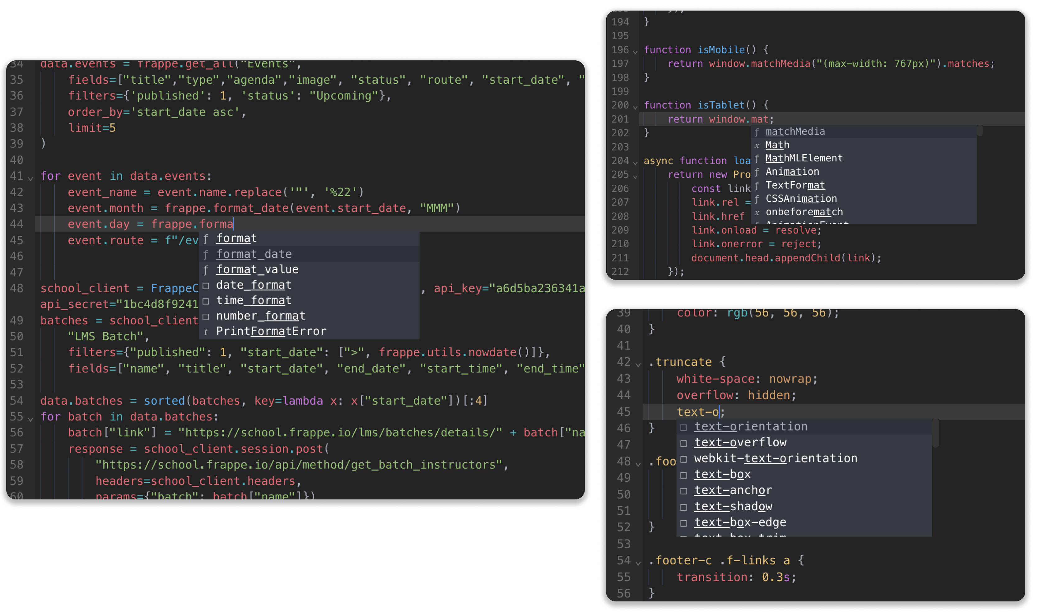 Code Editor in builder has autocomplete feature that suggests code as you type. It helps you write faster and with fewer errors by automatically completing variable names, functions, and syntax based on your current language.