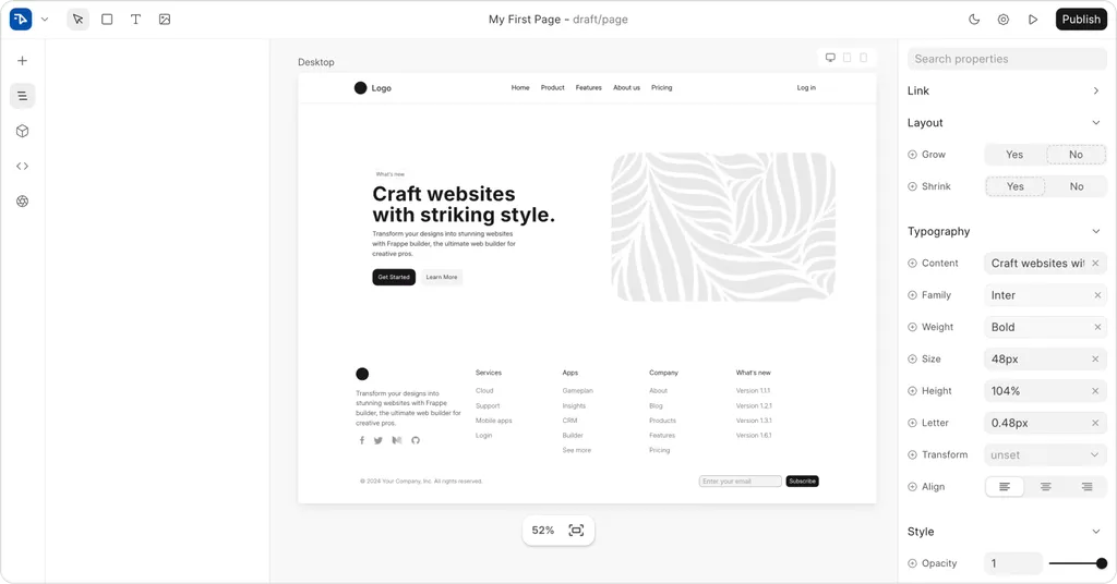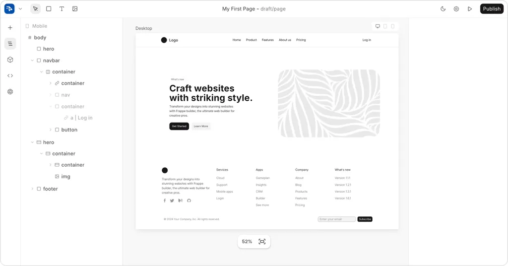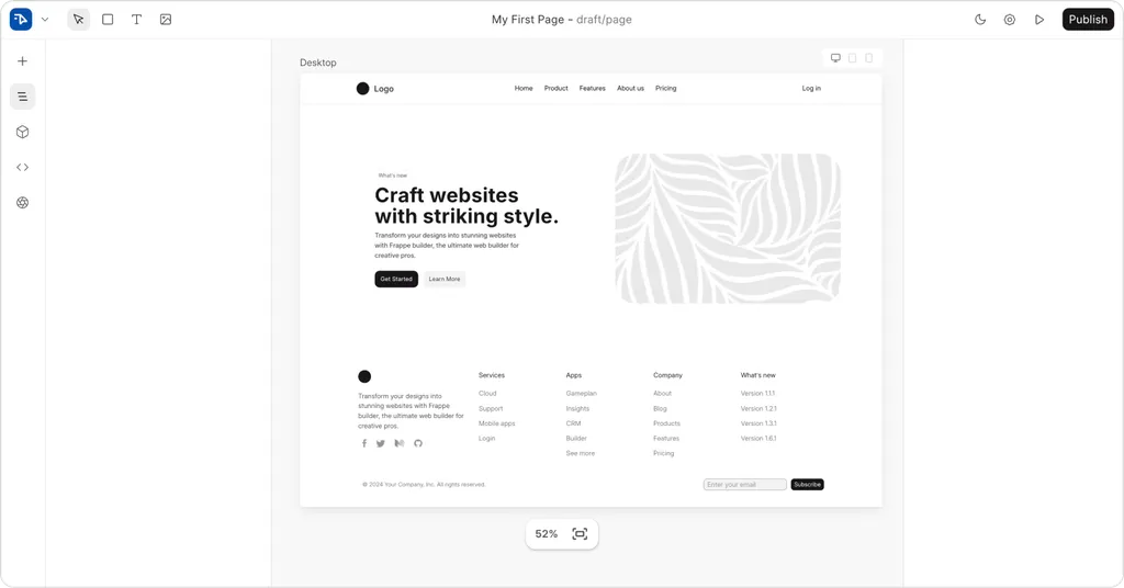 Meet Frappe Builder, a sleek new-age tool that helps you visually design and instantly publish lightning-fast webpages.