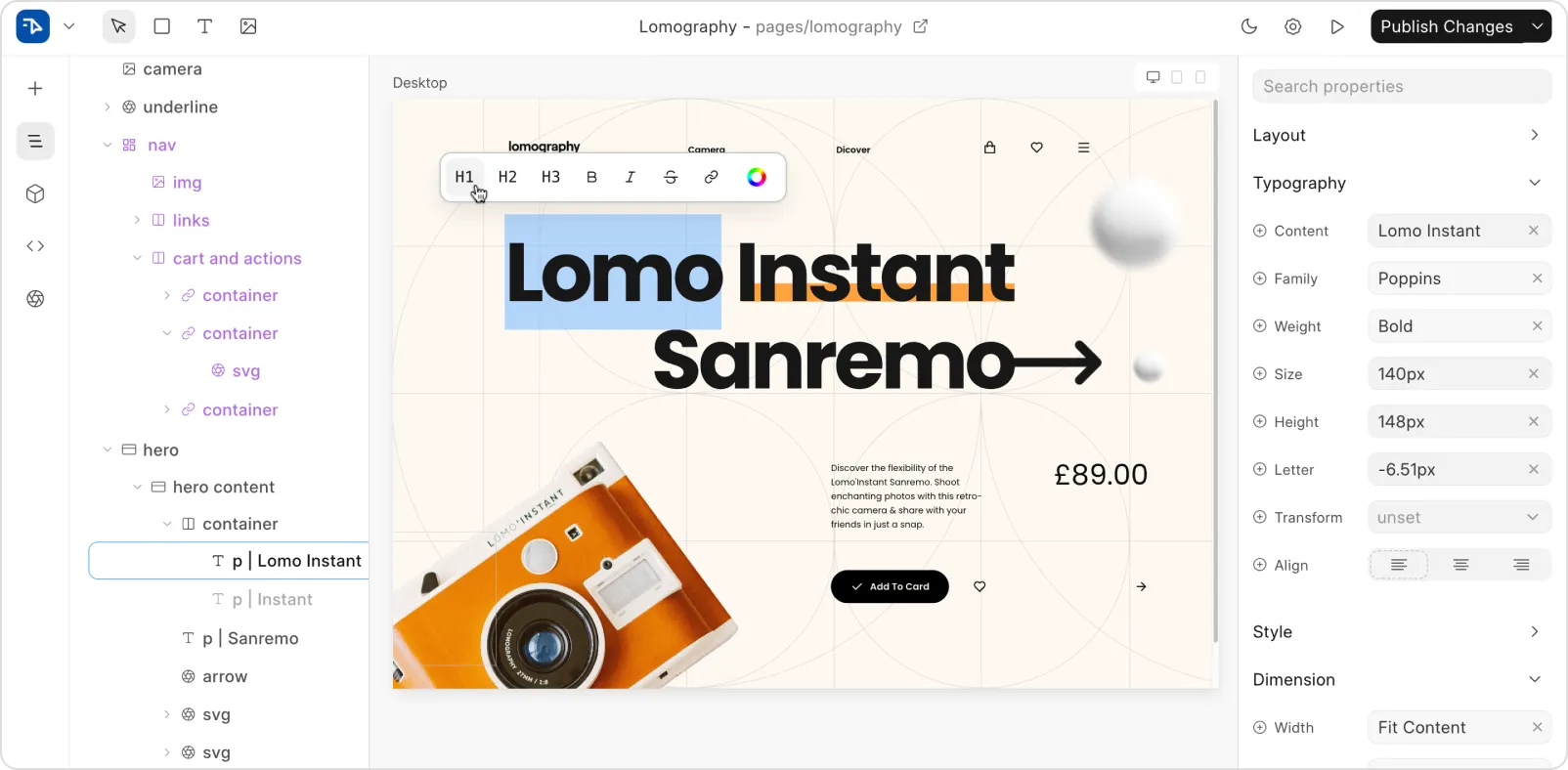 Builder features an intentionally clean workspace, as opposed to cluttered traditional no-code tools, while still giving everything you need for pixel-perfection.