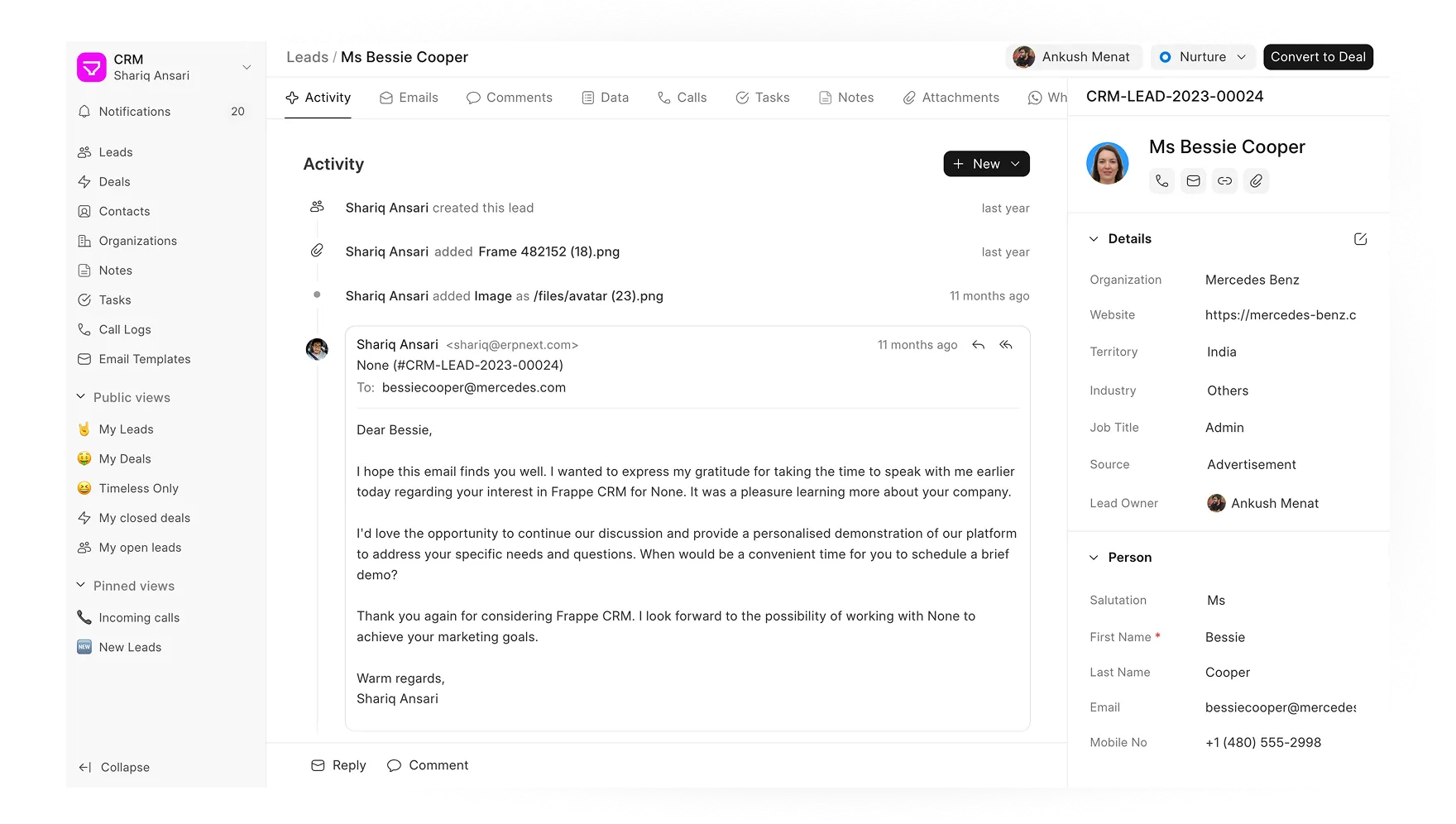 Whether they come from your website, referrals, or email, Frappe CRM captures them all in a single queue. You can track every call, email, and note, so when it's time to reach out, you know exactly where things stand.