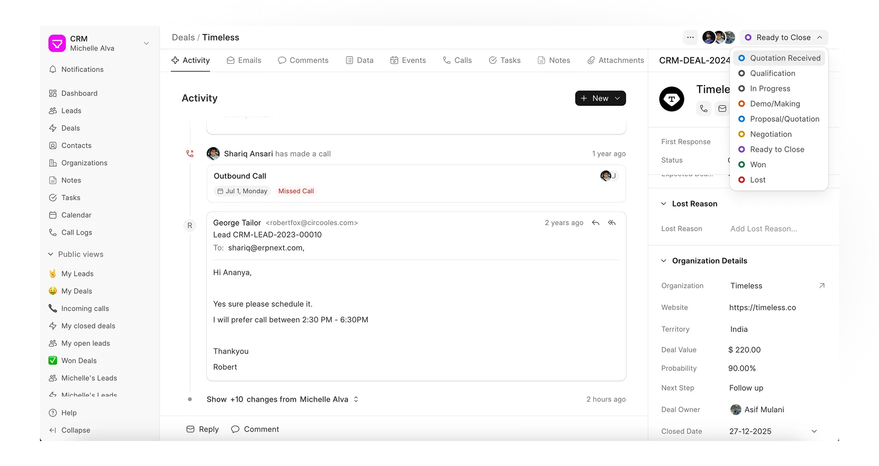 Frappe CRM integrates with ERPNext, allowing you to generate quotations and create customers directly from deals. No duplicate entries, no switching between systems—just everything flowing naturally from one step to the next.