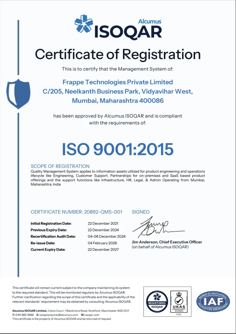 In 2021, Frappe took the strategic step of implementing a Quality Management System (QMS) and an Information Security Management System (ISMS) across its departments, leading to the achievement of ISO 9001:2015 and ISO 27001:2013 certifications.