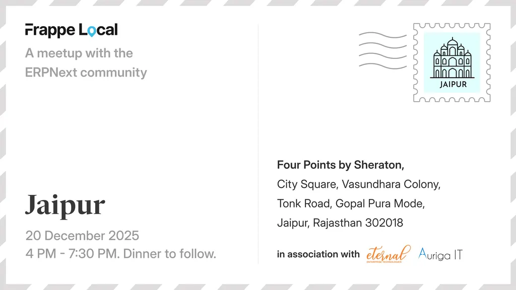 In collaboration with Auriga IT and Eternal Tech, Frappe Local comes to Jaipur this December to gather the local ERPNext community of business owners, developers, and open-source enthusiasts. The evening will feature talks, real stories, networking opportunities with peers in your region and a chance to meet the Frappe team.