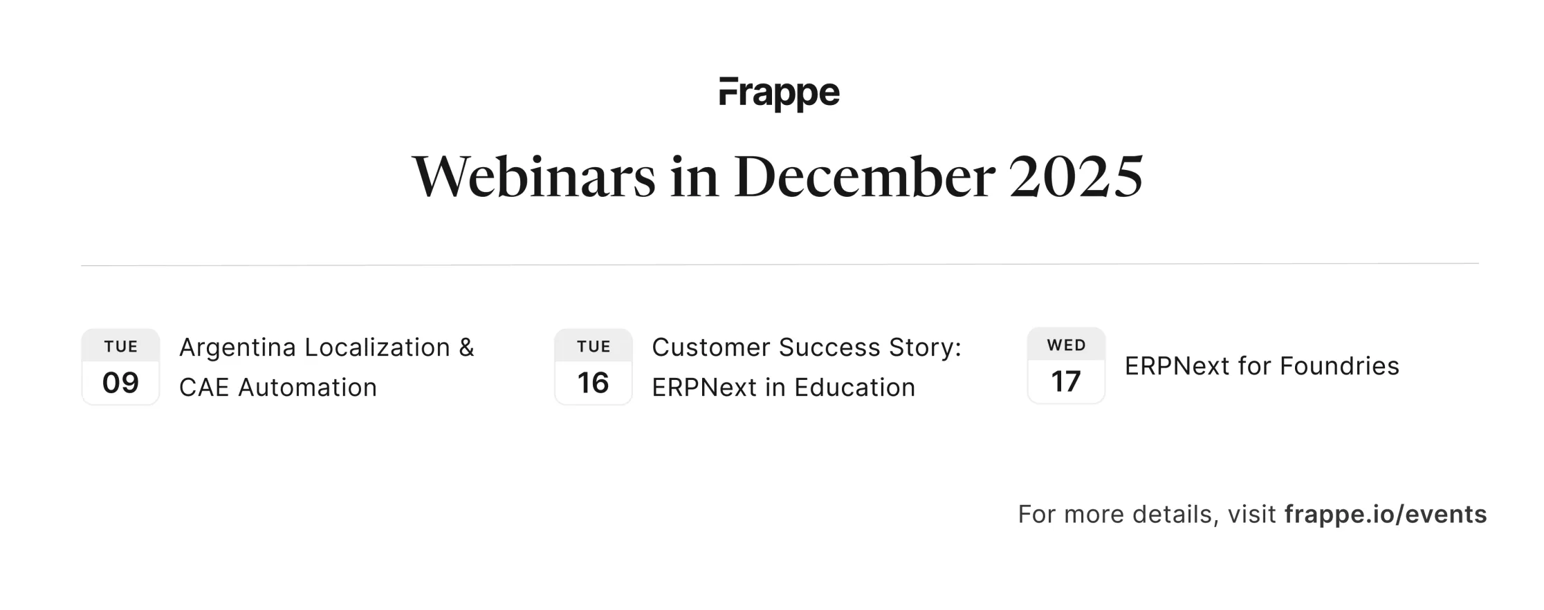Started in November, we tried a new webinar format to highlight real business scenarios from the ecosystem. WThis December, we’re back with another success story of a partner and customer building together with Frappe. We’ll also demonstrate the Argentina localization app and take a closer look at a foundry business running on ERPNext.